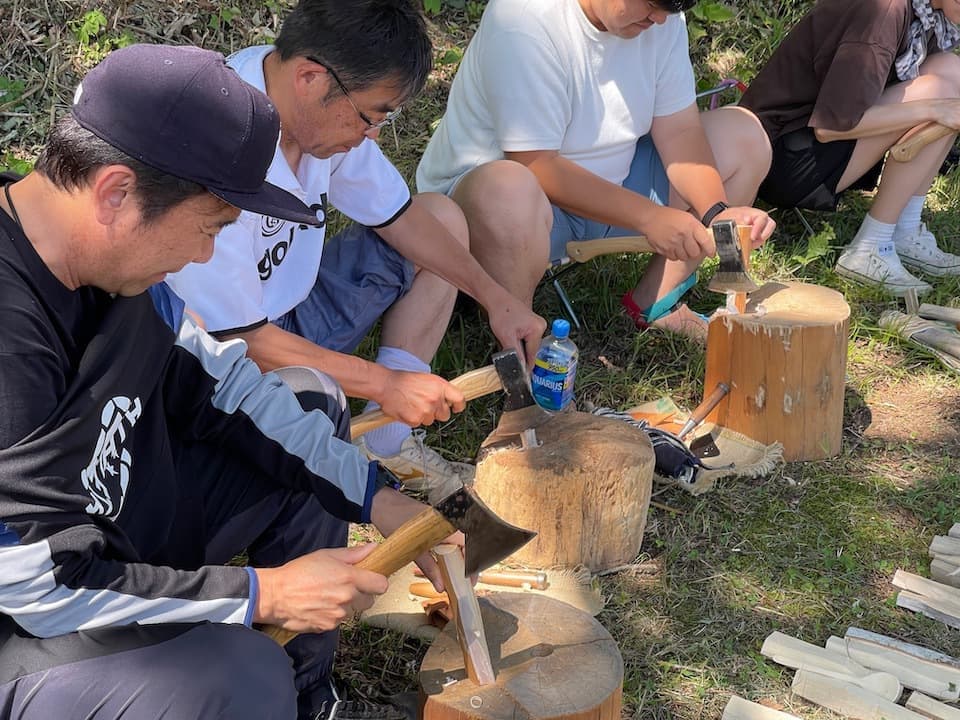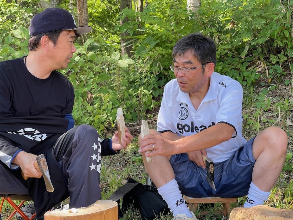 を仕上げるのかを考えながら削るのが楽しい。手斧、モーラナイフ、丸ノミ使用。